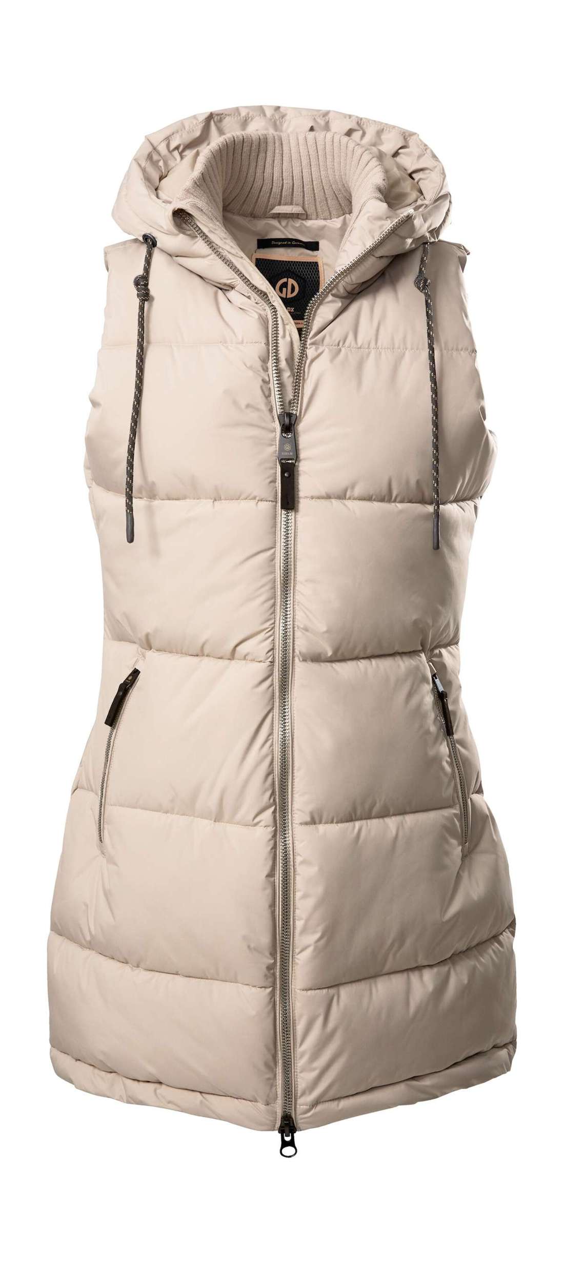 Mit der langen Funktionsweste in Daunenoptik von G.I.G.A. DX liegt man voll im Trend. Die Steppweste ist wasserabweisend, winddicht und gleichzeitig atmungsaktiv. Die Kapuze und der bequeme Strickkragen schützen zusätzlich vor Kälte und Wind. Die Weite vom Saum kann anhand eines Kordelzuges reguliert werden. Zwei Reißverschlusstaschen und eine Innentasche bieten Stauraum für Handy, Schlüssel und Co. Der 2-Wege-Reißverschluss ist mit einem praktischen Kinnschutz versehen, der ein Einklemmen der Haut verhindert. killtec liegt es besonders am Herzen, die Kollektionen nachhaltiger und zukunftsfähiger zu machen. So setzt killtec verstärkt auf verantwortungsbewusstere Herstellungsverfahren. Diese Weste wurde daher mit fluorfreien Mitteln imprägniert und teilweise aus recyceltem Material hergestellt.