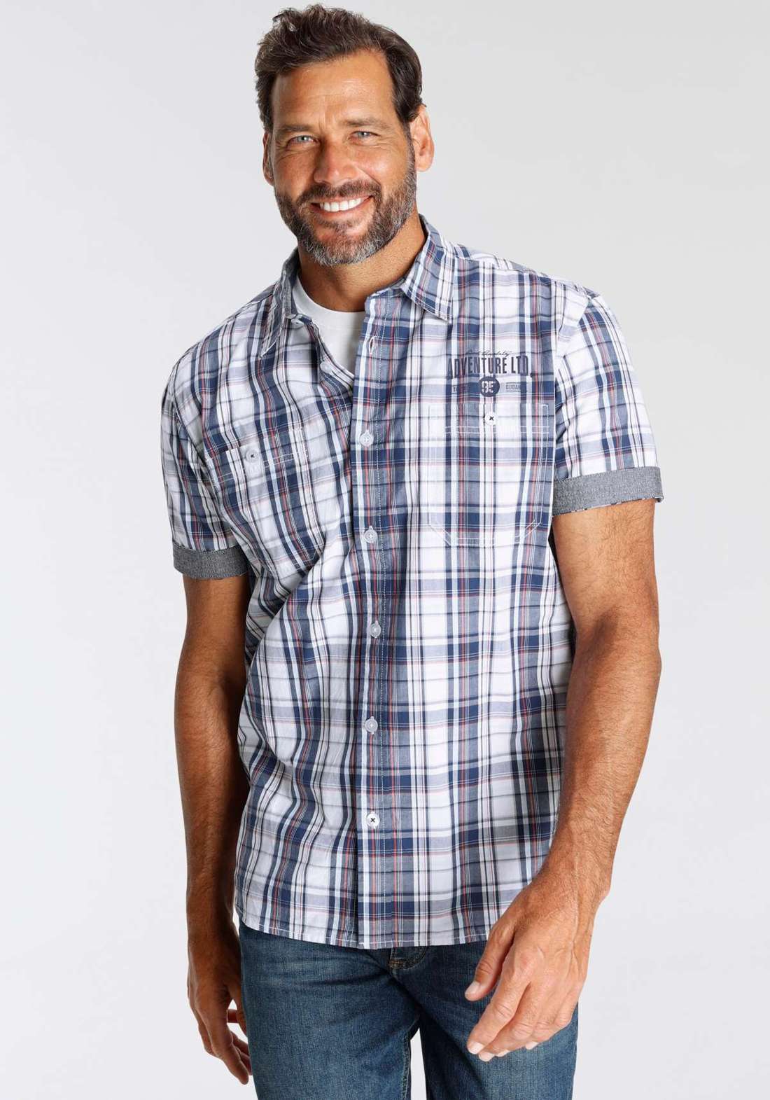 Klassisches Herren-Kurzarmhemd der Marke Man's World. Mit einem komfortablen Schnitt. Es ist mit einem coolen Aufdruck versehen. Durch den leichten Webstoff fühlt sich das Oberteil luftig auf der Haut an.