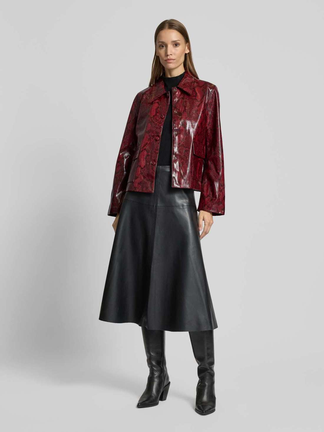 Hauptmaterial 1: Polyurethan 100% Damen Jacke von mbyM Gerader Schnitt Leder-Optik Modell 'Yoshi' Umlegekragen Durchgehende Knopfleiste Aufgesetzte Pattentaschen Rückenlänge bei Größe S: 61 cm Schulterbreite bei Größe S: 41 cm Brustweite bei Größe S: 50 cm Ärmellänge bei Größe S: 62 cm Pflegehinweise: handwäsche; nicht bleichen; kein trockner; nicht bügeln; chemische reinigung: perchlorethylen, kohlenwasserstoffe erlaubt. Das Model ist 179cm groß und trägt Größe S