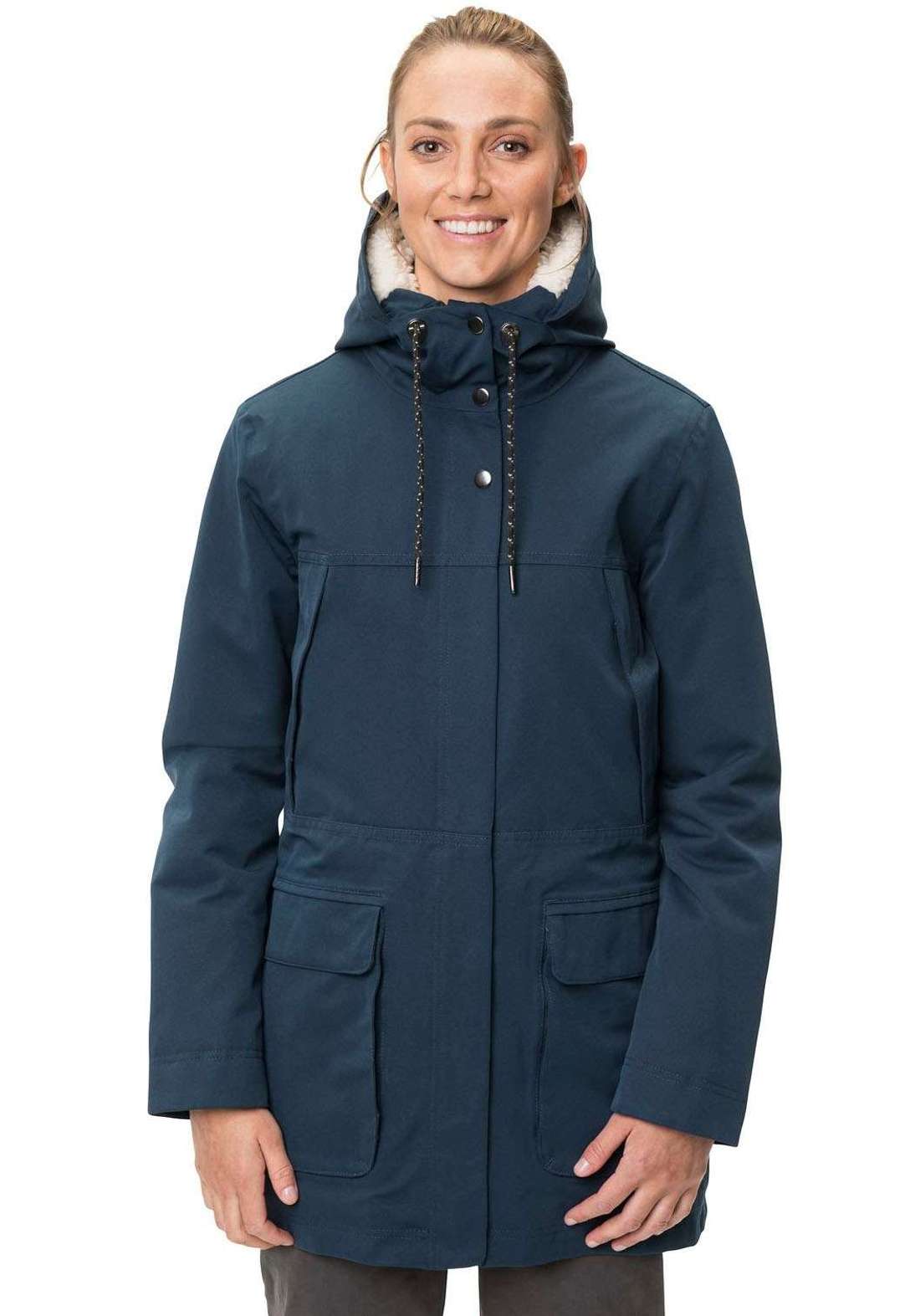 Mit dem Parka von VAUDE kommen Sportlerinnen in Höchstform. Er hat verdeckte Druckknöpfe sowie eine Kapuze mit Kordelzug und Innenfutter. An den langen Ärmeln ist ein Bündchen. In den Brusttaschen können Kleinigkeiten schnell verstaut werden. Aufgelockert wird der Look mit einer Logostickerei. Der Parka ist atmungsaktiv, schnell trocknend, winddicht und wärmend. So schützt er vor dem Auskühlen — nach, während und vor dem Outdoor-Sport. Er passt gut zu einem atmungsaktiven Oberteil. So kann schnell auf unerwartete Wetterumschwünge reagiert werden und die Sporteinheit kann auch bei plötzlichem Regen weitergehen.